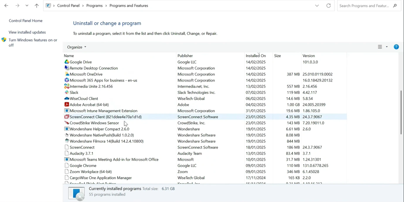 4. A list of installed programs will appear. You need to look for Microsoft 365.