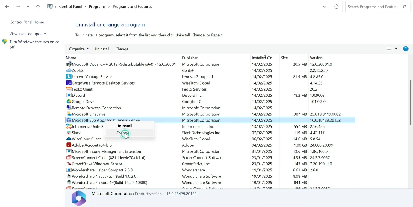 5. Right-click on Microsoft 365, then click on “Change.”