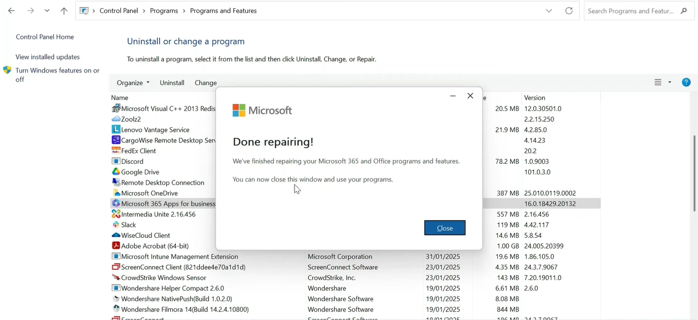 - Once the installation is completed, restart Outlook and check if the issue is resolved.