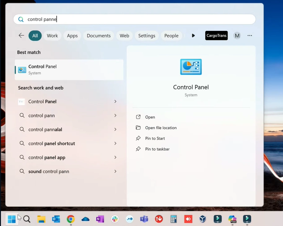 2. Type “control panel” in the search bar, and open it.